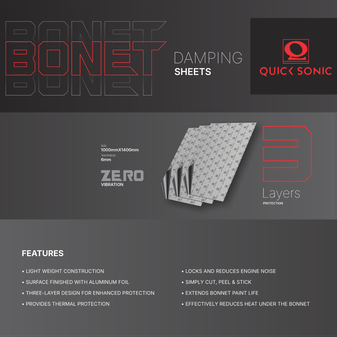 Enhance your vehicle’s comfort and protection with the Quick Sonic Most Dense Damping Sheet. Designed with a 3-layer aluminium composite structure, it reduces engine noise, insulates heat, and extends bonnet paint life. Lightweight yet durable, it’s easy to install — simply cut, peel, and stick for instant thermal and soundproofing performance.