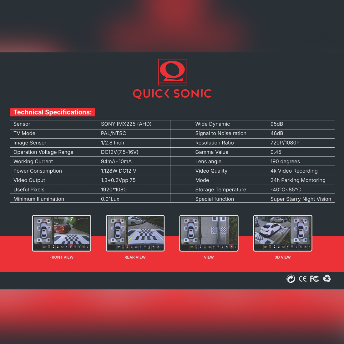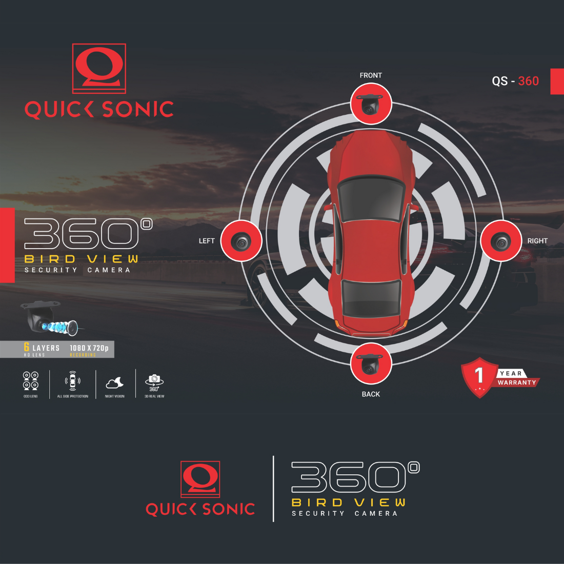 Get a complete view around your vehicle with the Quick Sonic QS-360 Bird View Security Camera. Powered by the SONY IMX225 AHD sensor, it delivers crystal-clear 4K recording, super starry night vision, and 360° real-time monitoring for ultimate safety. Features front, rear, and side view coverage, 24-hour parking monitoring, and wide 190° lens for total visibility in all directions.