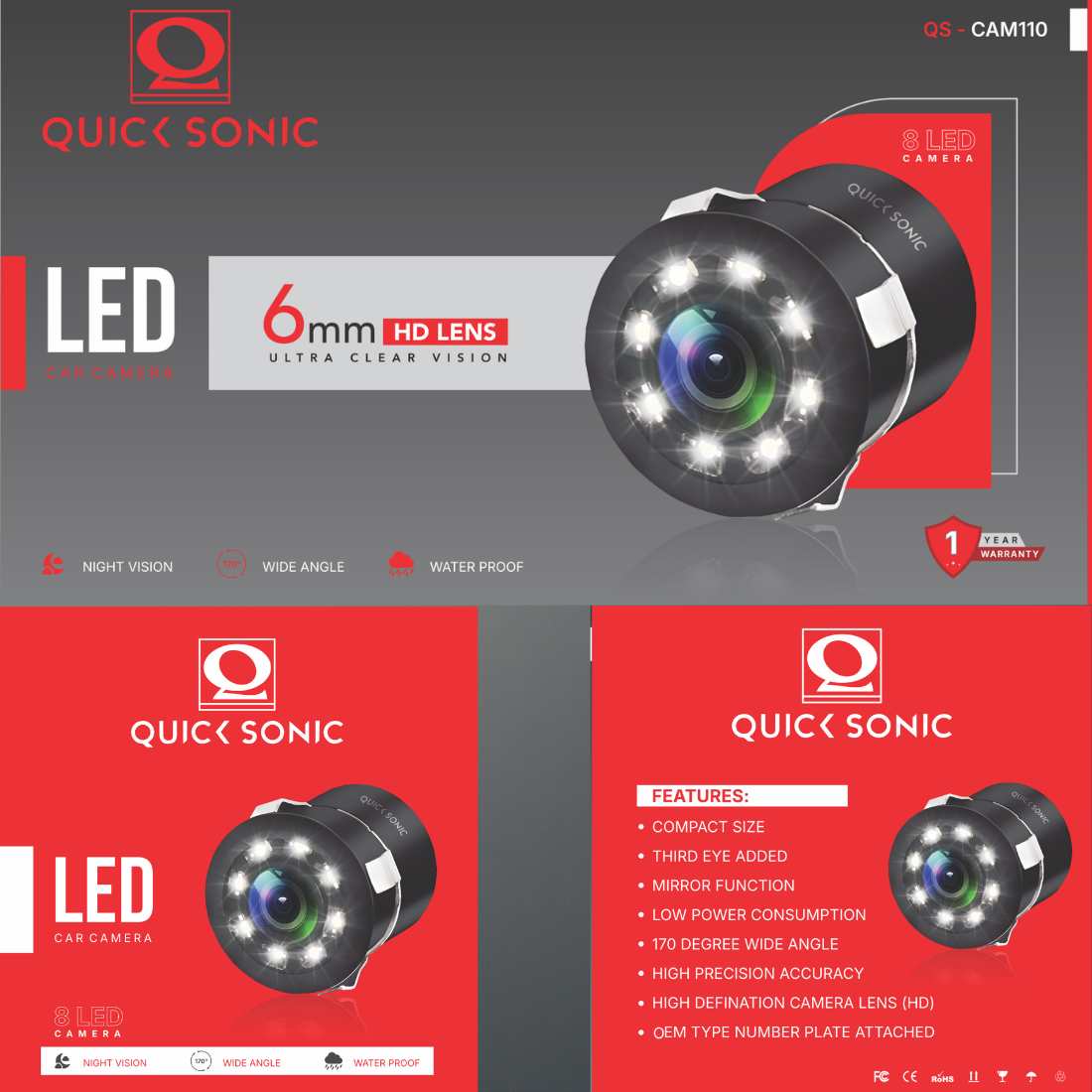 Enhance your car’s safety with the Quick Sonic QS-CAM110 LED Camera — built for HD live screen view, night vision, and weatherproof performance. Its bright LED light ensures clear visuals in all conditions, making parking and reversing smooth and effortless.