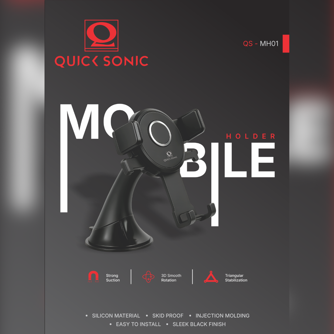 Keep your phone secure on every ride with the Quick Sonic QS-MH01 Mobile Holder. Featuring strong suction, 360° smooth rotation, and triangular stabilization, it ensures maximum grip and stability. Made with premium silicon material, this holder is skid-proof, easy to install, and finished in sleek black for a modern look.
